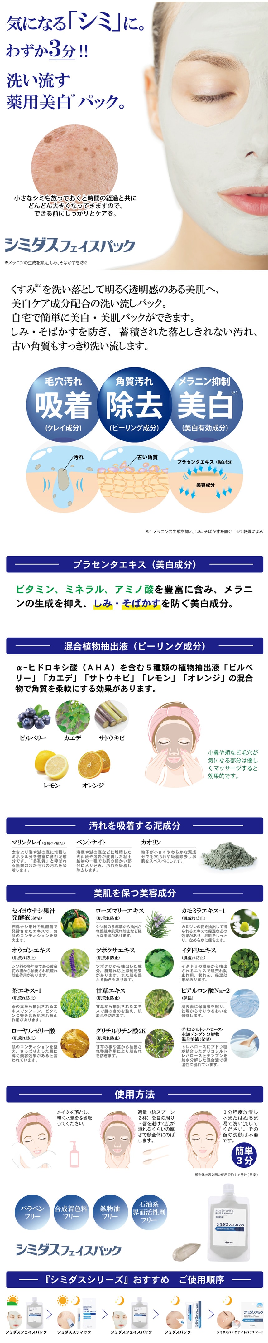 フェイスパック 日本製 洗い流す シミダスフェイスパック 医薬部外品 毛穴 プラセンタ ローズマリー 送料無料 100g 信憑 グリチルリチン酸 ベントナイト